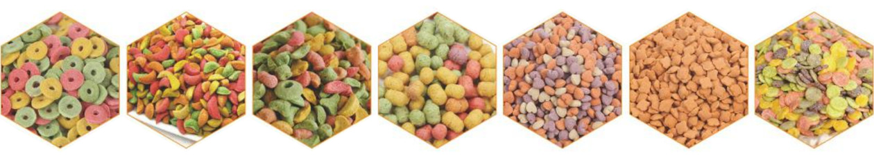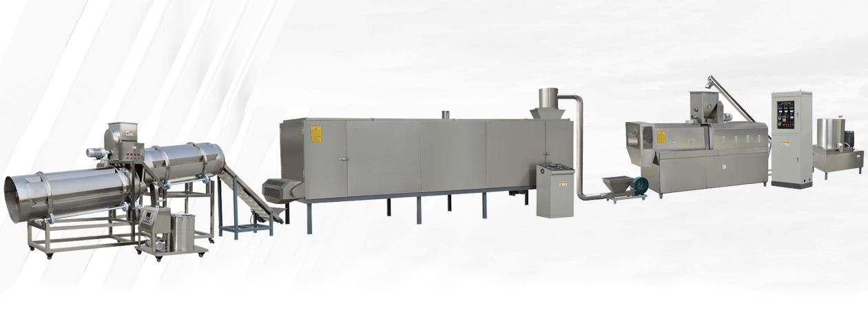 10.調(diào)味線:包括提升機、調(diào)味機、單(雙)滾筒,噴油機。對烘干好的顆粒進行表面涂油和添加各種維生素。噴涂技術采用先進技術。