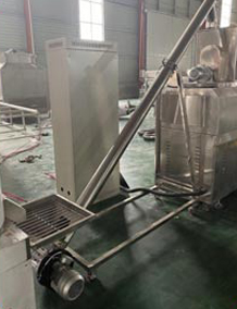 生產(chǎn)線構(gòu)成:拌粉機(jī)→螺旋提料機(jī)→膨化主機(jī)→振動(dòng)篩→風(fēng)送機(jī)→壓片機(jī)→風(fēng)送機(jī)→冷卻攤料機(jī)→五層烘箱→提升機(jī)→震動(dòng)攤料機(jī)→高溫烘干機(jī)→提升機(jī)→單滾筒噴涂線→烘箱→冷卻輸送機(jī)
