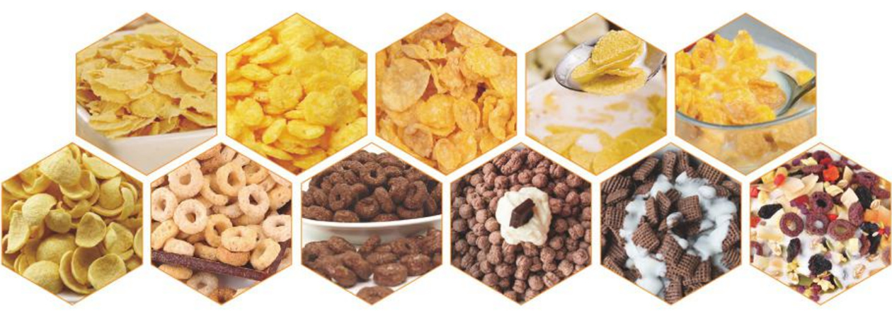 早餐谷物食品作為一種方便快捷、營(yíng)養(yǎng)豐富且比較均衡的食品很快進(jìn)入千家萬(wàn)戶。在現(xiàn)代加工中通常采用擠壓機(jī)來(lái)完成,對(duì)加水后玉米粉混合物的充分揉制、蒸煮熟化和切粒壓片成型。玉米片的營(yíng)養(yǎng)豐富且比較均衡,是不可多得的谷物類早餐食品,通常與牛奶一起食用。